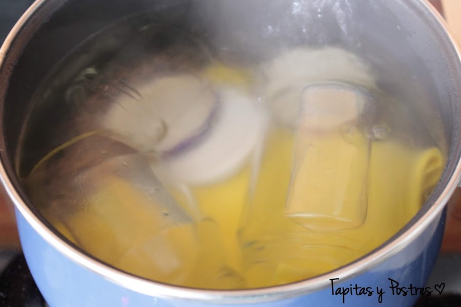 Ahora para evitar cualquier tipo de problema de salud, debemos hervir de nuevo los botes llenos en una olla con agua fría hasta que los cubra. Una vez que el agua comienza a borbotear hervimos. 30 minutos será suficiente.