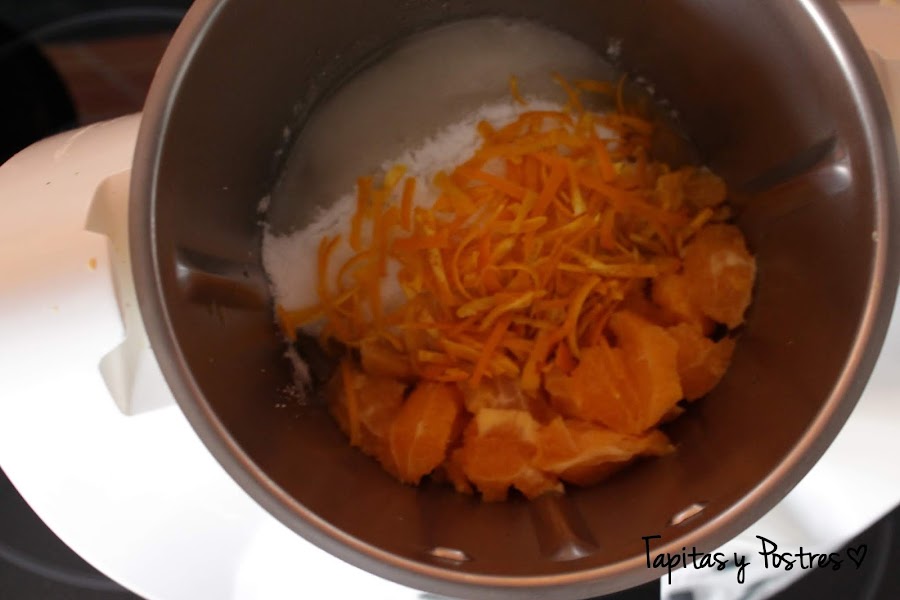 Cortamos las naranjas en cuartos, quitamos las pepitas que haya y las hebras centrales Las ponemos en el vaso de la thermomix con el zumo que vayan soltando. Añadimos el azúcar, el zumo de limón y la piel de una de las naranjas cortadas en tiras (muy bien lavada y sin nada de blanco).