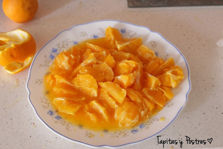 Con las naranjas bien lavadas las pelamos y quitamos toda la parte blanca. Troceamos y quitamos las pepitas.