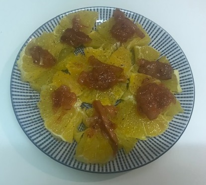 Preparación:Lava y seca las naranjas. Quita la parte superior e inferior. Trocea las naranjas, en rodajas finitas.