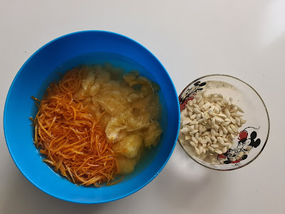 5. - Añadimos un vaso de agua al bol de las pepitas, tapamos con film y pesamos la mezcla de pulpa y cáscara y le añadimos un vaso de agua o 200ml por cada medio kilo y tapamos también y dejamos reposar hasta el día siguiente.