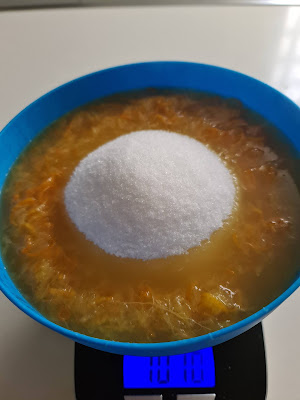 7. - Se pone a cocer esta mezcla a fuego muy suave durante 40 minutos, desde que empiece a hervir. Cuando termine, pesamos el resultado y añadimos el mismo peso de azúcar.