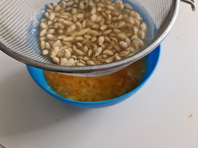 6. - Día 3, cogemos el bol de la semillas, si lo miráis con detalle, veréis que le agua se ha vuelto como gelatina, es lo que necesitaremos para darle una textura especial a la mermelada, así que la colaremos y se echa la gelatina resultante a la mezcla de pulpa y cáscara.