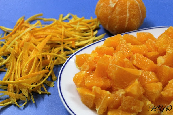 1. Lavamos las naranjas y el limón, los secamos y con un pelador les quitamos la monda. Debe quedar muy finita, evitando la parte blanca que es más amarga. Reservamos.