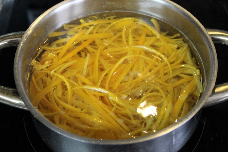 3. Recuperamos las mondas de naranja y limón para cortarlas en tiras muy finitas. A continuación, las ponemos en una cazuela a hervir, cubiertas con agua, durante diez minutos.