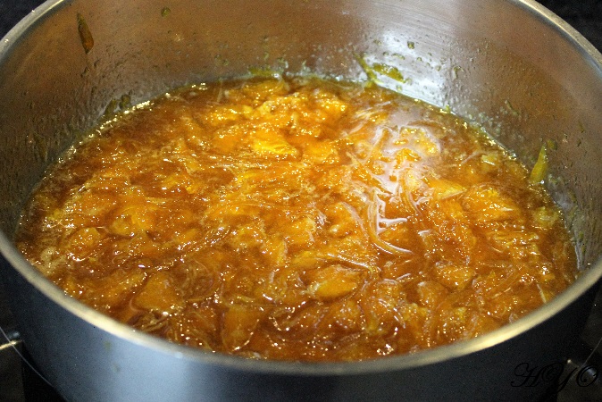 4. Ahora que tenemos todo preparado empezaremos a cocinar la mermelada. En una cacerola ponemos la pulpa de naranja, el azúcar, las mondas bien escurridas, el zumo de medio limón (el mismo que antes habíamos pelado) y los 600 ml de agua.