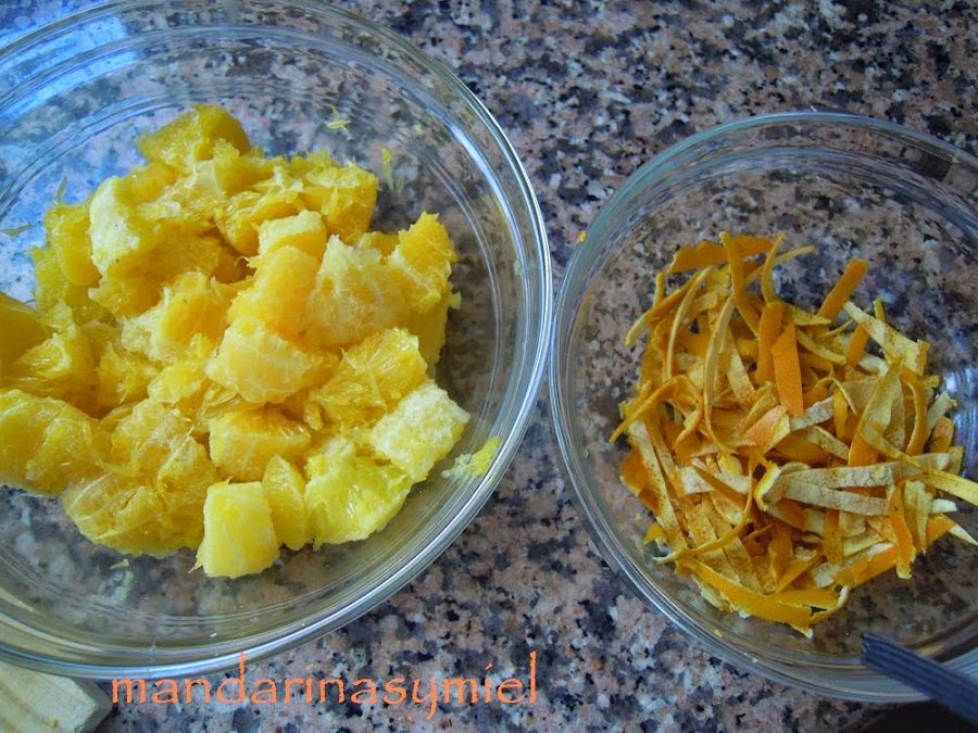 Seca las naranjas cocidas, quítales la piel y con la punta de un cuchillo rasca lo blanco, corta en tiritas finas.