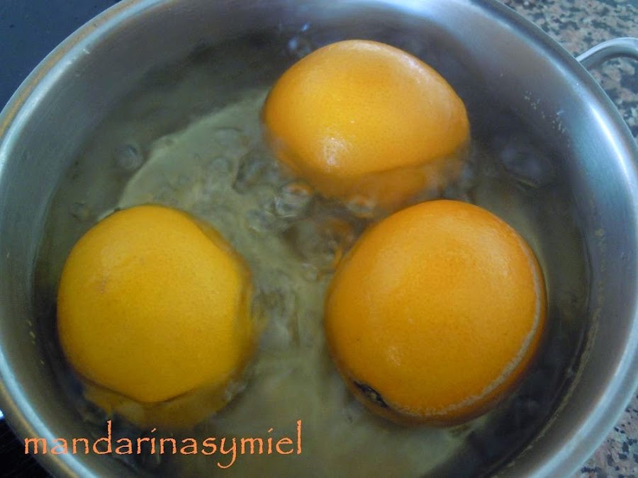 Lava bien las naranjas y ponlas enteras, a cocer en agua hirviendo unos 20 minutos.