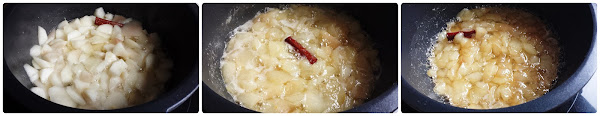 Ponemos un cazo a fuego fuerte e introducimos el azúcar, las peras troceadas, el jengibre rallado, la miel, la canela en rama y el zumo del limón.