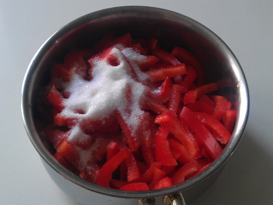 Echamos los pimientos troceados en un cazo con el agua y el azúcar y ponemos a cocer media hora a fuego medio alto, removiendo de vez en cuando. Yo lo puse en el 6-7.
