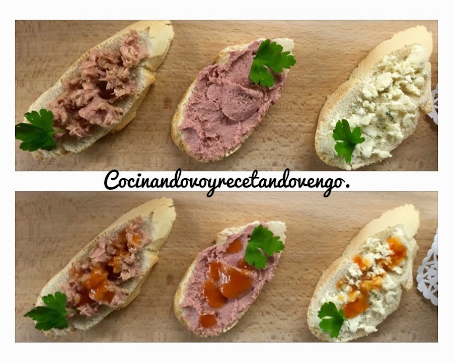 Aquí os muestro unas tostas de pan con atún, paté y queso azul, hay más versiones como queso crema, anchoas, filetes de pollo, hamburguesa, pincho de tortilla etc.