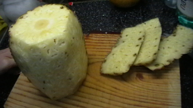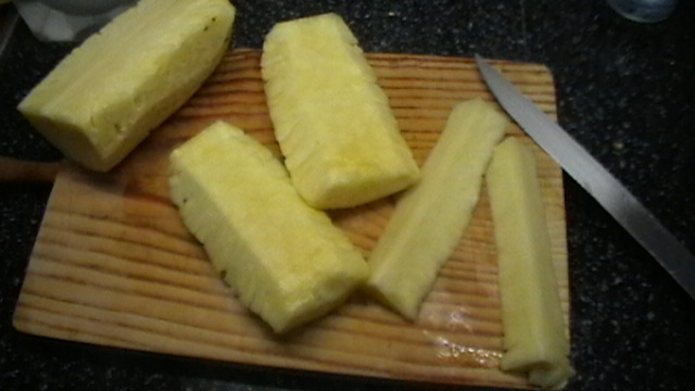 Pelamos la piña y la cortamos en cuartos, sacaremos el corazon......