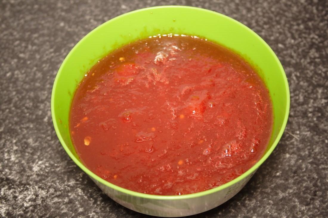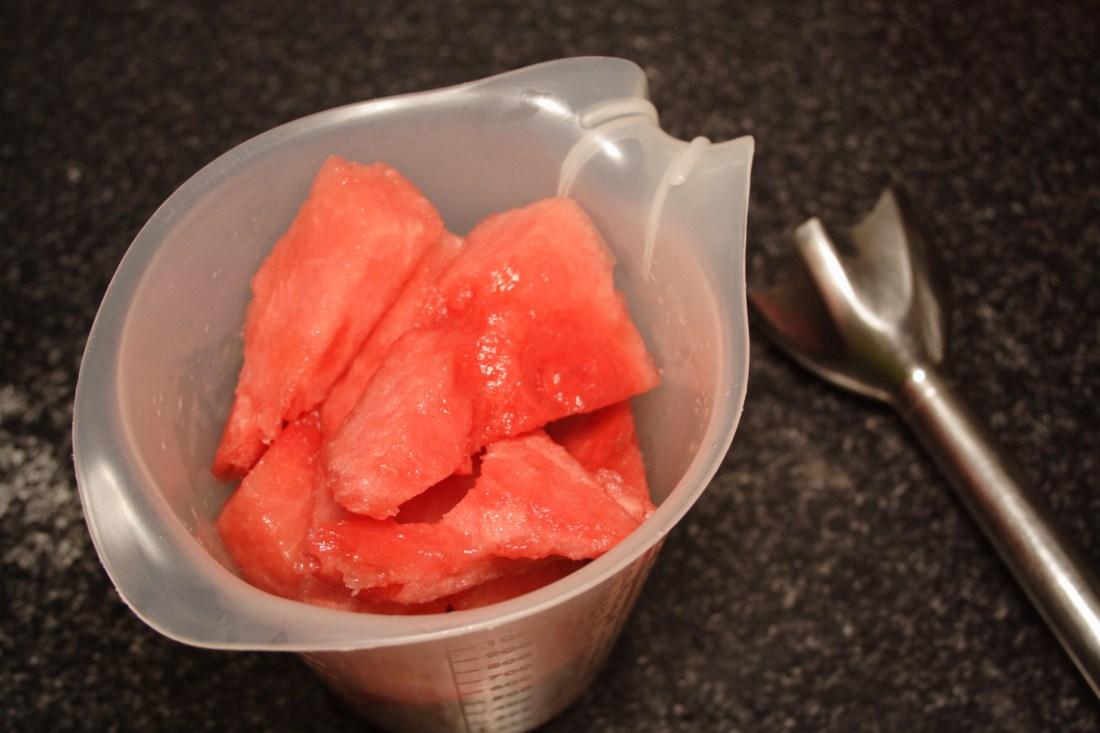 Le quitamos la corteza y las pepitas a la sandía (si queda alguna la podemos retirar en la cocción), troceamos, ponemos en un vaso batidor o jarra y trituramos con la batidora.