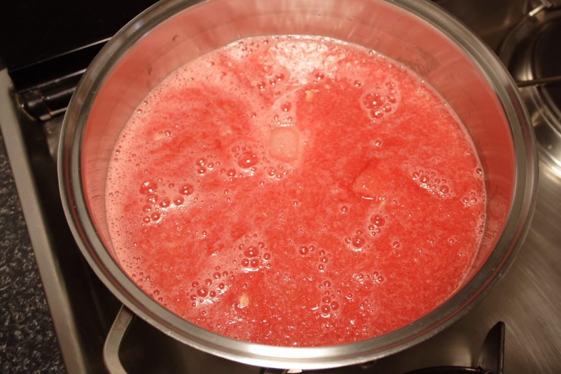 Vertemos en la cazuela con el azúcar y el zumo de limón y ponemos a cocer a fuego medio durante 70 minutos (la receta original ponía 40 minutos) o hasta que obtenga la textura mermelada.