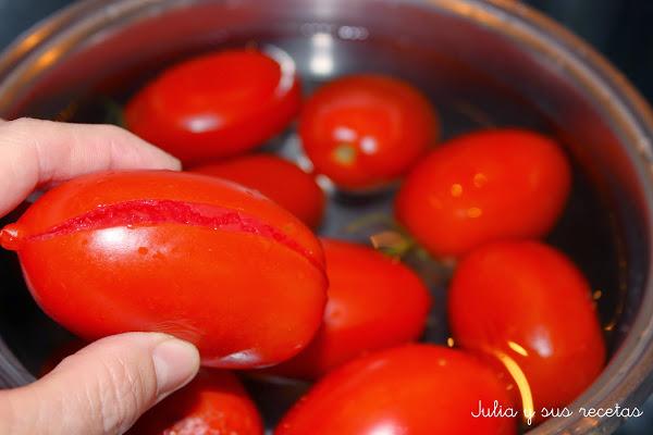 Lo primero de todo es pelar los tomates. Para hacerlo mejor les hacemos una raja en forma de cruz en la base y los metemos en agua hirviendo unos minutos.