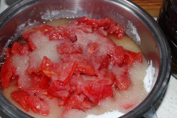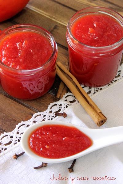 Ya os he dicho algunas veces que tengo la suerte de tener verduras ecológicas muy cerca de casa, pero ademas es que tengo un vecino que tiene huerto y me ha traído una caja de tomates enorme, tanto, que he hecho, tomates en conserva, tomate frito y como no , una estupenda mermelada de tomate.