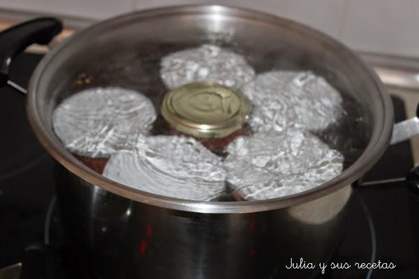 La metemos en tarros esterilizados (hervidos en agua unos minutos, escurridos y secos), los tapamos bien y si queremos tenerla durante meses la ponemos en recipiente al baño maría, cubiertos de agua, cociedolos durante 15-20 minutos contados desde el momento en que empiece el agua a hervir. Los dejamos enfriar dentro del agua.