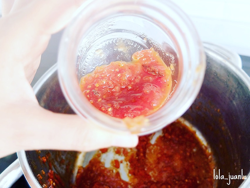 A continuación, ponemos todos los ingredientes en una olla a fuego alto hasta que rompa a hervir, pasándolo posteriormente a fuego medio-bajo. Vamos removiendo continuamente y pasada una hora y media tenemos nuestra mermelada hecha. Se sabe que está lista cuando coge un tono brillante.