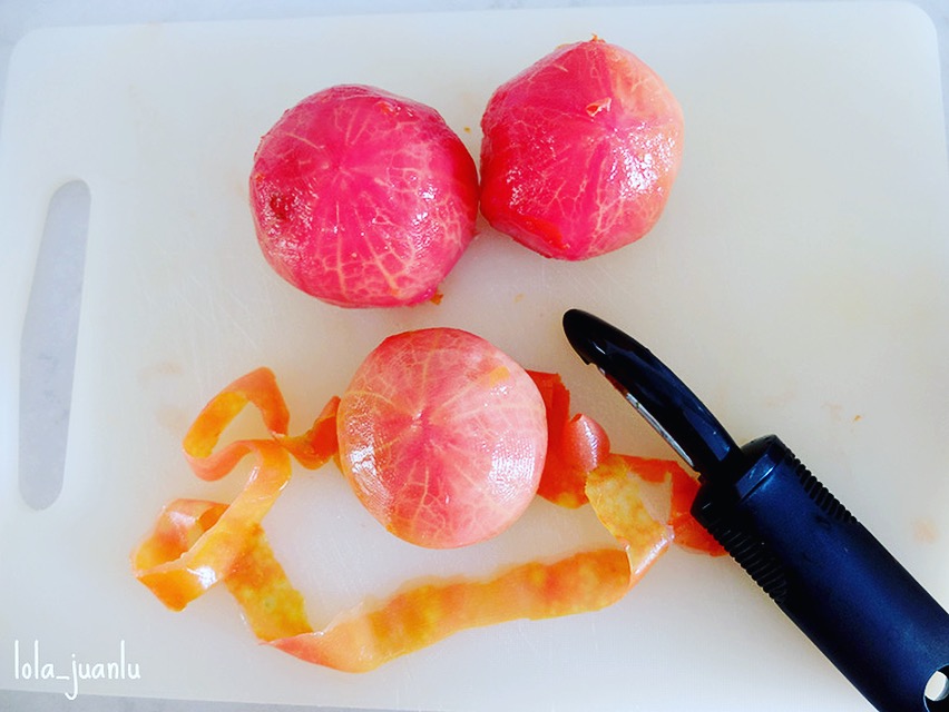 Una vez tenemos los tarros listos, nos podemos poner con la mermelada, para ello, lavamos los tomates, los secamos con papel de cocina, los pelamos y los cortamos en trozos muy pequeños.
