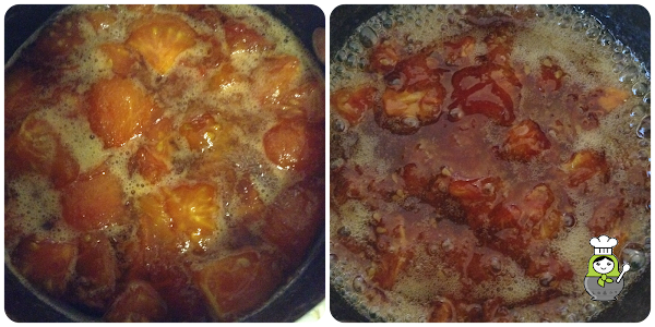 Los pelamos y cortamos en trocitos pequeños y los ponemos en una tartera. Encima del tomate ponemos el azúcar, el zumo de limón y la vainilla.