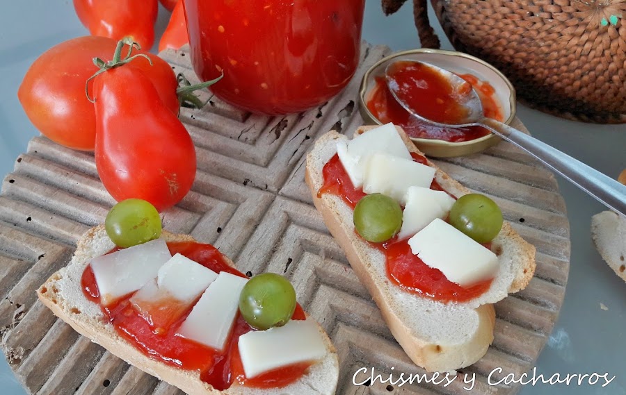 Rebanada de pan de pueblo con mermelada de tomate, queso de pata de mulo y uvas del huerto. Una combinación deliciosa.