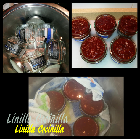 4. Ponga los botes de cristal y las tapas por separado (botes destapados) en una olla que los cubra y dejar que hiervan unos 25 minutos, sacarlos de la olla y dejarlos reposar. Llenamos los botes con la mermelada preparada con anterioridad, sin dejar burbujas en los botes. Tapamos bien y fuerte. Mientras calentamos agua en una olla y en el fondo ponemos un trapo, cuando empiece a hervir introducimos los botes boca abajo y que los cubra, unos 35 minutos. Se dejan reposar en la misma olla. Una vez los saquemos se limpian bien y se revisa que las tapas se hallan quedado con el botón para adentro. Cuando estén fríos etiquetamos y guardamos en lugar fresco y seco.