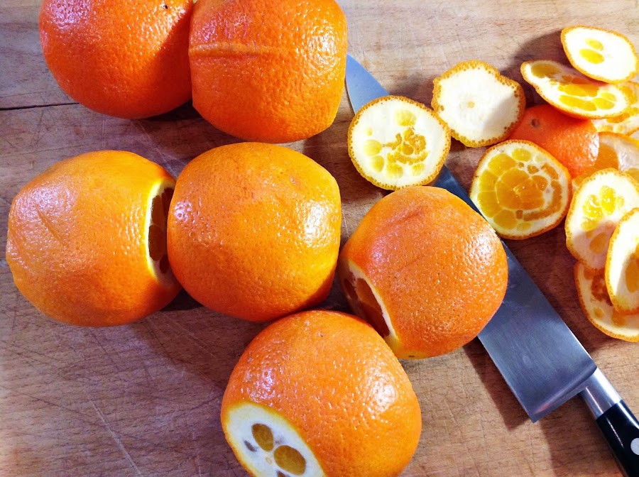 Lava muy bien las naranjas y corta los extremos de cada una.