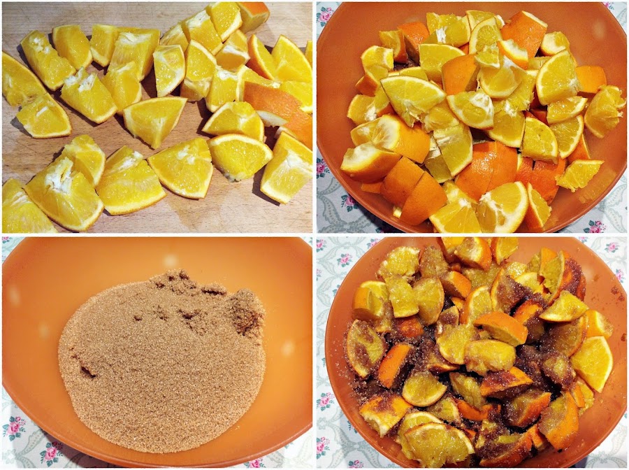 Para confitar las naranjas, añade el azúcar junto con el cardamomo. Tapa con papel film y deja confitar 1 noche.