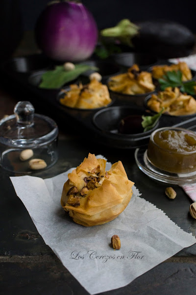 PASTELITOS CRUJIENTES DE MERMELADA DE BERENJENAS, QUESO FETA Y PISTACHOS