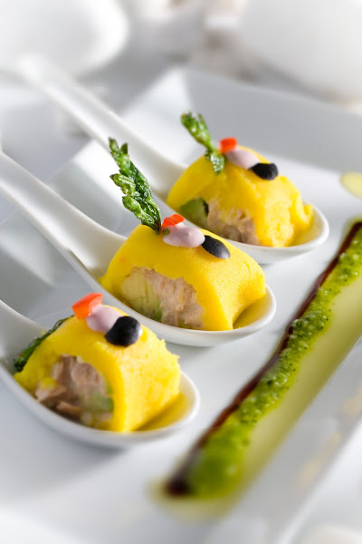 -Bombita de arroz con pato, con crema huancaina y salsa criolla.