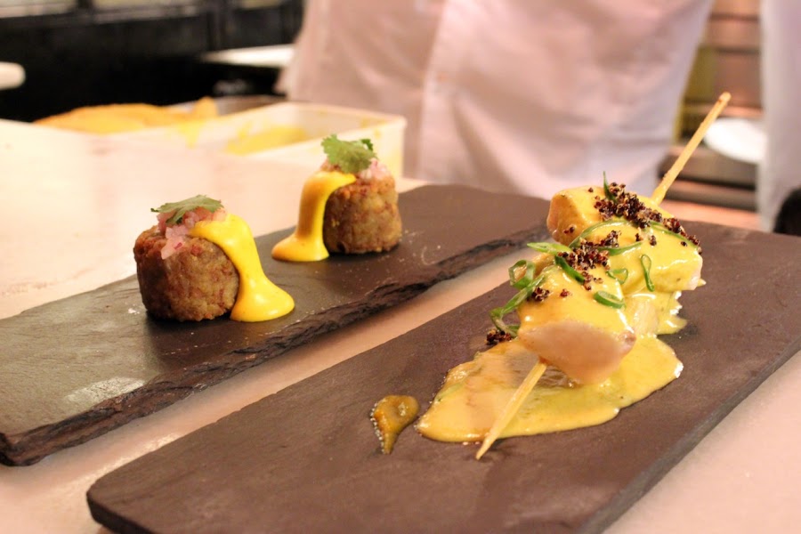 -Anticucho de emperador con salsa fría de maracuyá y ají amarillo, plátano asado y quinua negra crujiente.