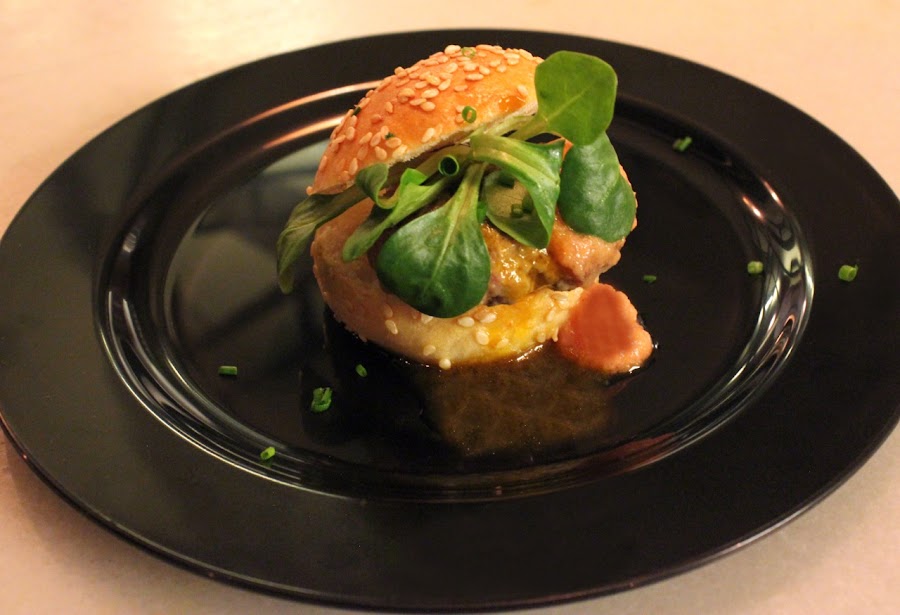 -Minihamburguesa de Wagyu con adobo de anticucho y puré de tomates con salsa Keemuchi.