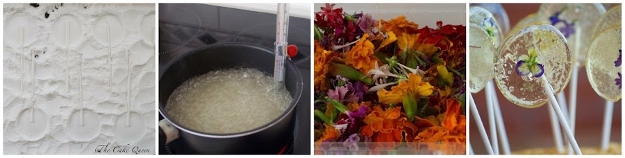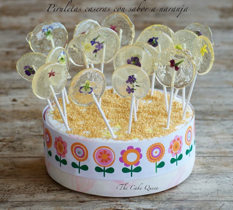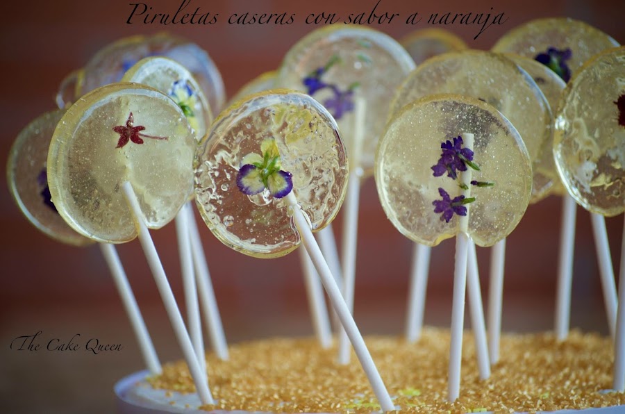 7. Si lo deseas puedes decorar tus piruletas con las flores orgánicas comestibles, debes de añadirlas mientras el sirope esté caliente para que se adhieren a éste.
