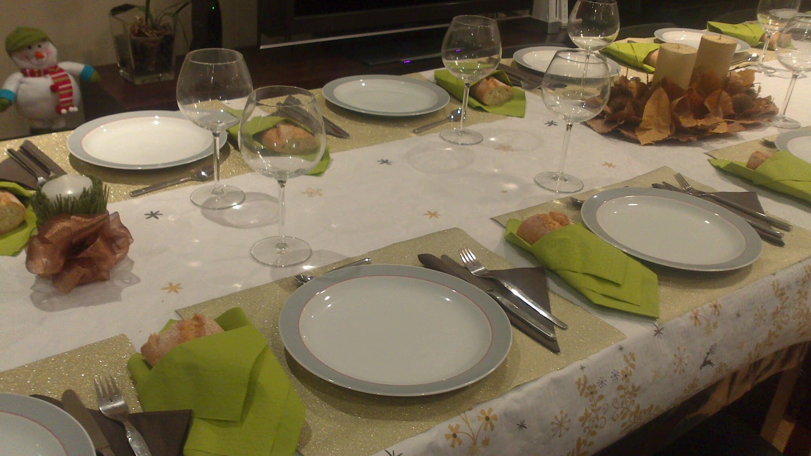 Utilice un mantel de papel, los salva manteles dorados que los compre en Casa (son de usar y tirar) y servilletas verdes y negras de Ikea.