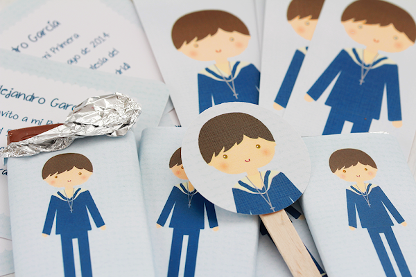 Tenía muchas ganas de preparar esta mesa dulce de comunión de niño. El kit imprimible lo diseñé hace dos años con Photoshop, pero aunque había hecho fotos de los toppers, invitaciones, etc. me faltaba preparar los dulces a juego.