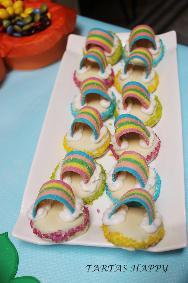Unas galletas oreo bañadas en chocolate blanco,decoradas con cristales de azúcar de colores y un arco iris con las nubes de glasa.