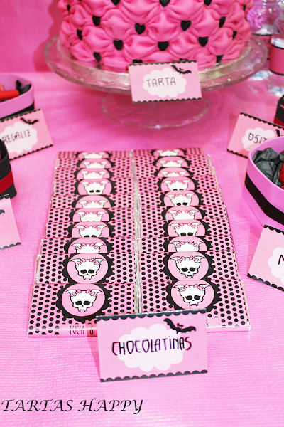 Unas chocolatinas decoradas con un envoltorio de la calavera de Draculaura y cartelitos a juego.