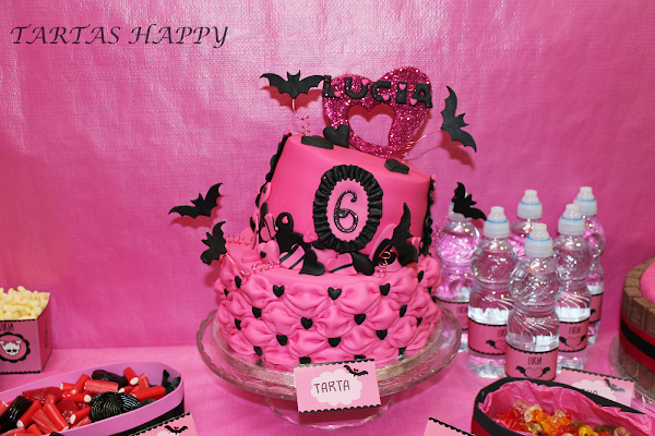 Y no podía faltar coronando la mesa su tarta rosa,pero esta vez no quería hacer la típica tarta de Draculaura con la muñeca y como quería experimentar distintas técnicas esta era la ocasión para hacerlo y me atreví con mi primera tarta inclinada eso sí sólo incliné un piso que hay que ir poco a poco.