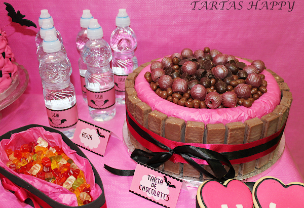 Una tarta de chocolatinas con los bombones teñidos de rosa ,esta tarta la hizo mi hermana que poco a poco se va metiendo cada vez más en este dulce mundo.