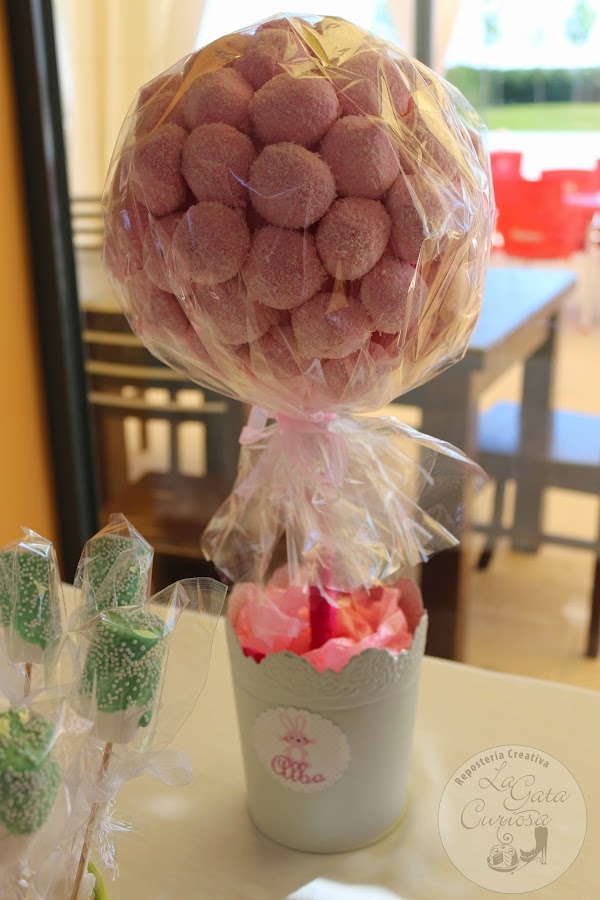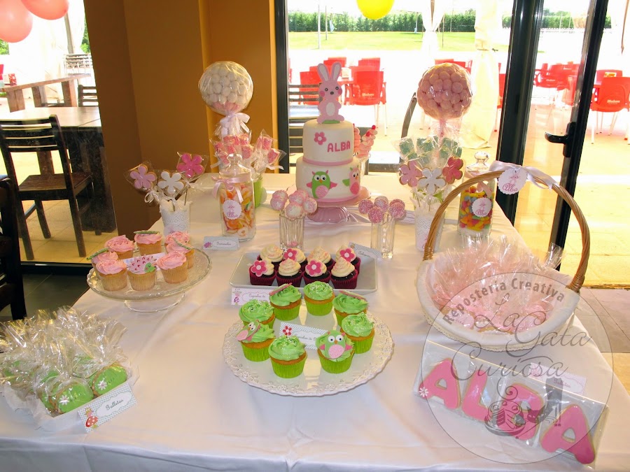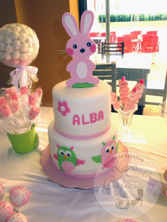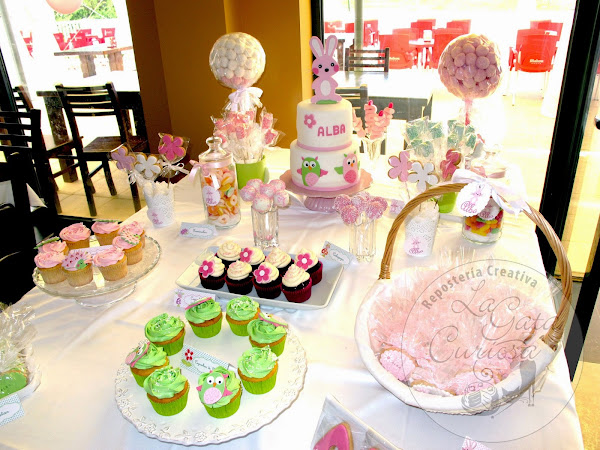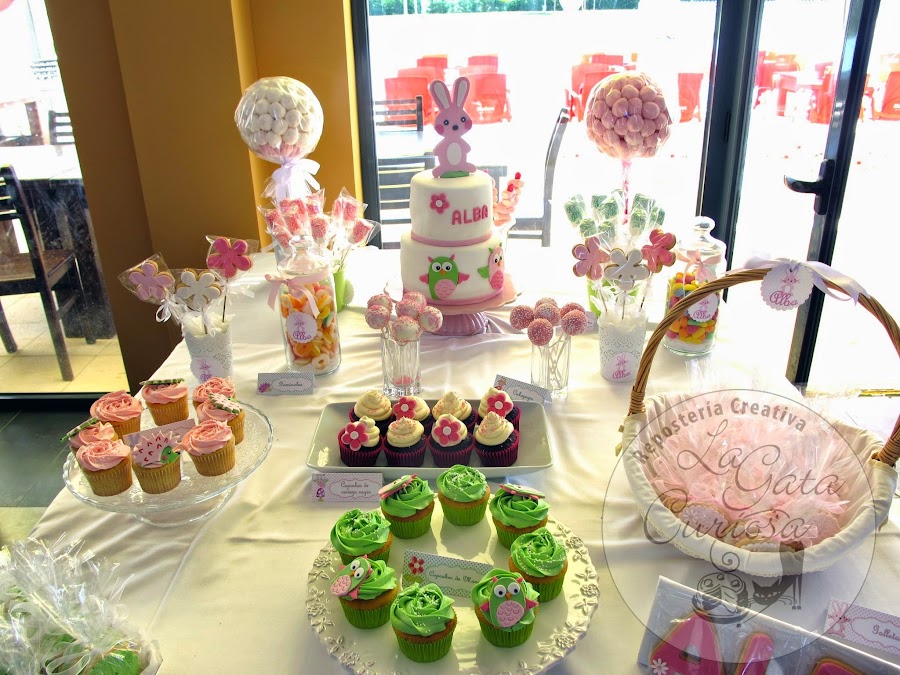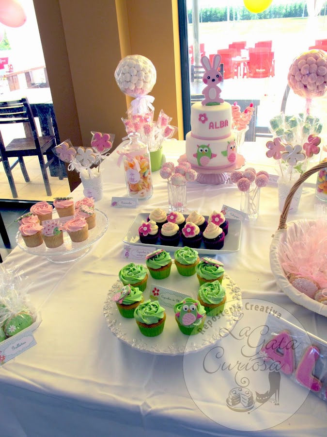 Tanto el conejo que va sobre la tarta como los búhos que van debajo y que también adornan unos cupcakes son como los del papel pintado aunque en los colores que elegimos para la mesa y que como podéis ver son el blanco, el rosa, y el verde.