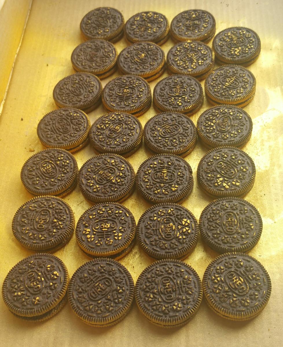 unas galletas oreo pintadas con spray comestible de oro para que parecieran auténticos doblones de oro