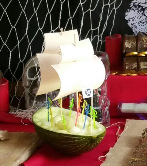 un melón piel de sapo cortado por la mitad a lo largo y sacamos toda la pulpa con la ayuda de un bolero para fruta (haz clic en el enlace y veras lo que es) después con unos pinchos de bambú para brocheta hice unos mástiles y las velas las hice cortando rectángulos de goma eva, para que los melones parecieran veleros.