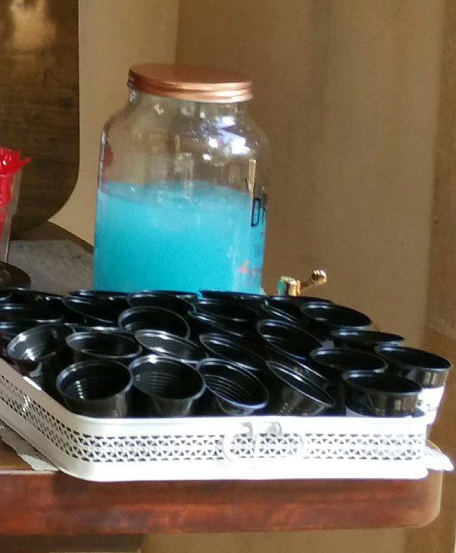 el dispensador de bebida lo llené con “agua de mar del caribe”, es decir Sprite y Blue Tropic Rives (NOcontiene alcohol) hay que echarle mucho hielo ya que es super dulce.