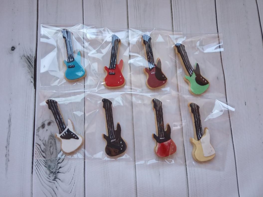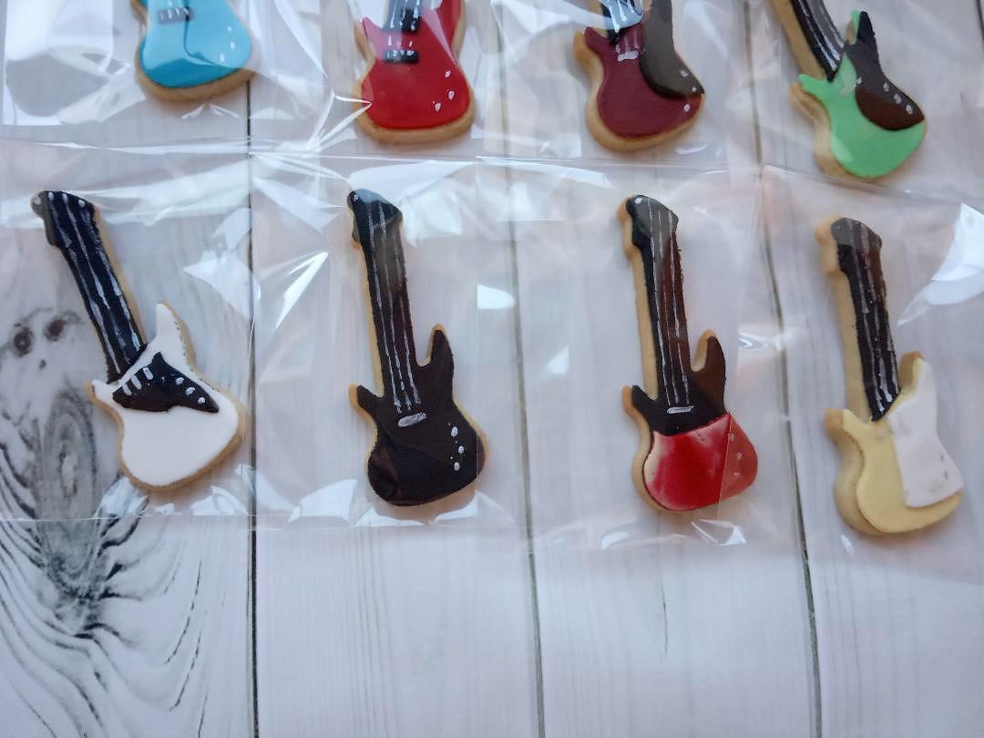 Unas galletas de mantequilla con vainilla y canela con forma de guitarra eléctrica y decoradas con fondant y pintura comestible.