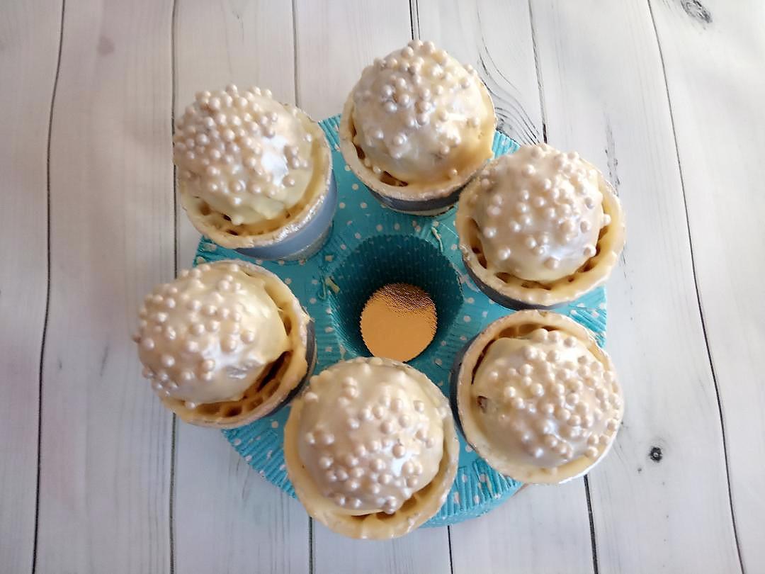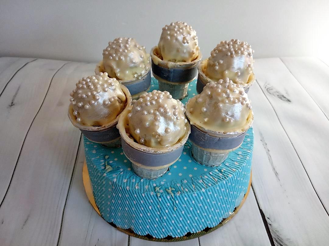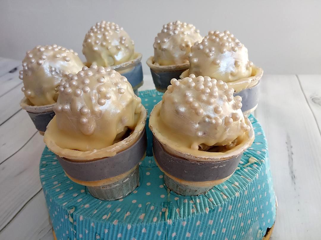 Unos cake pops de chocolate cubiertos con chocolate blanco y decorados con perlas de azúcar sobre una base de cucurucho de helado (imitando micrófonos).