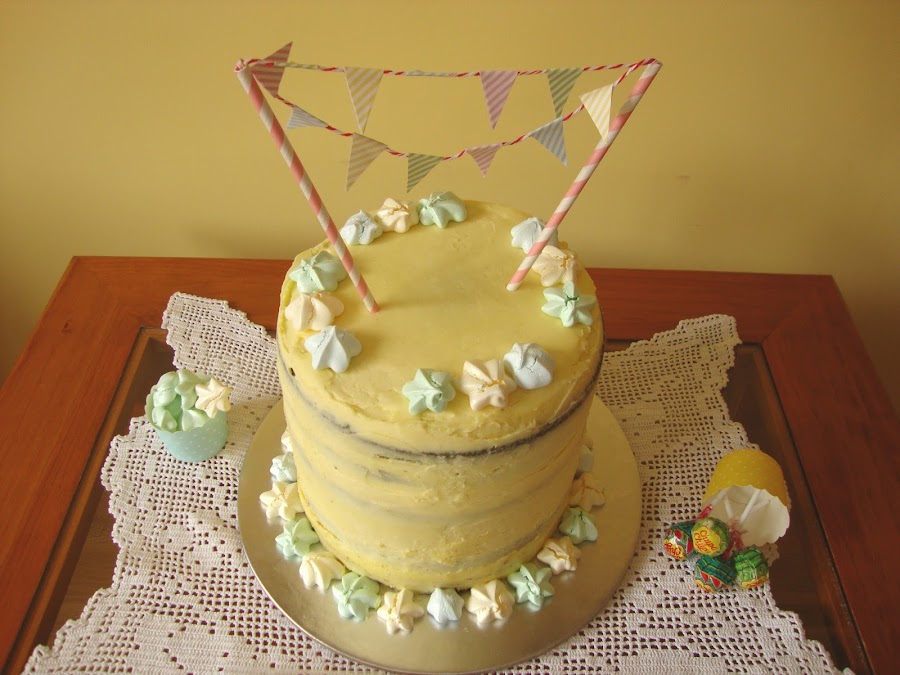 La tarta era una Naked cake compuesta por tres bizcochos Cuatro cuartos de vainilla, cada uno de ellos de un color (verde, amarillo y azul). El relleno iba alternando la crema de nata (crema de leche) y queso con otra capa de buttercream de vainilla. La altura final de la tarta era de 18 cm. Iba rematada y rodeada con unos merengues de vainilla.