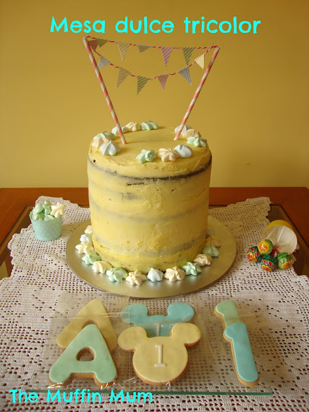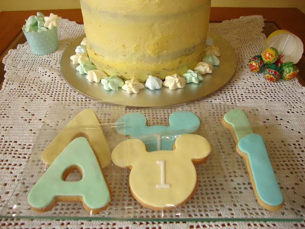 Las 39 galletas tenía forma de 1, de A y el contorno de Mickey e iban decoradas con fondant de los colores de la fiesta. Las galletas eran de mantequilla, unas con sabor a vainilla y otras a speculous.