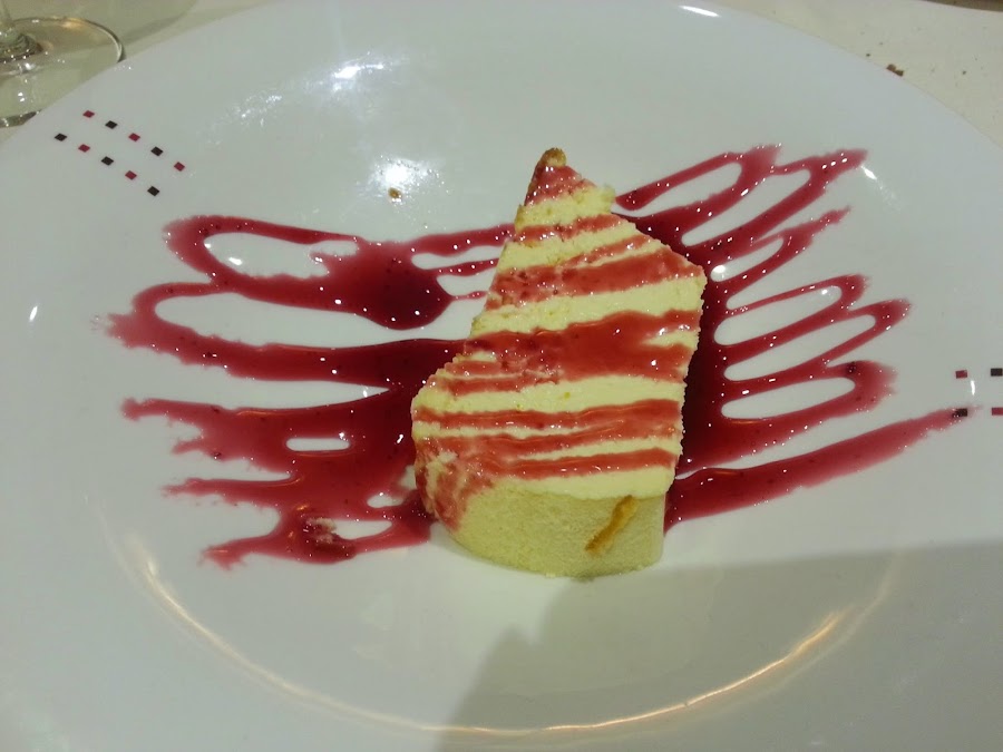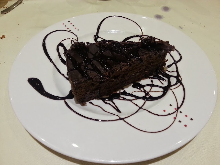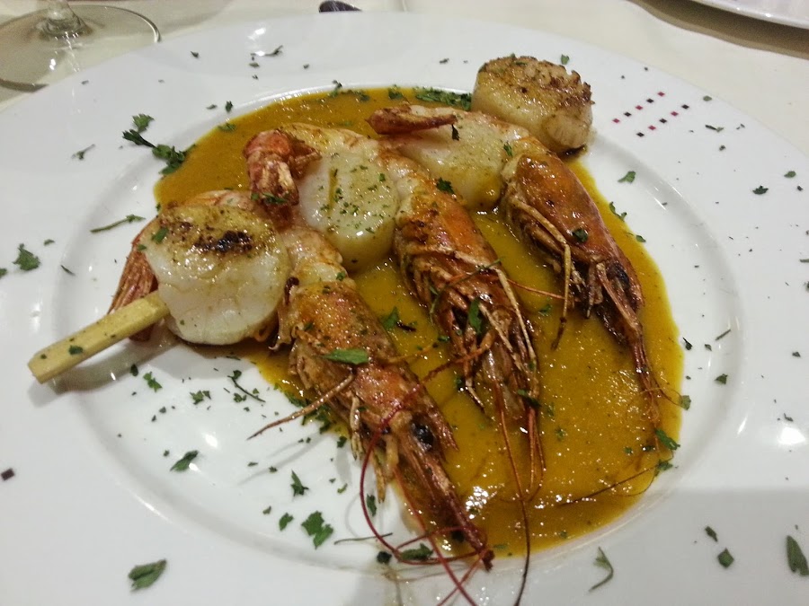 Lengua curada Brocheta de viera y gambon a la plancha con salsa de marisco que para mi estaba un poco salado y un postre para cada uno tarta de chocolate y tarta de queso.