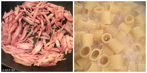 Os enseño en esta fotografía inferior el bacon, sin nada de aceite en el fondo de la sartén y a la derecha la pasta cociendo solo con un poco de sal. Siempre igualmente se recomienda que la pasta y a poder ser, que sea la rayada (pasta rigate) pues se adhieren mejor las salsas.