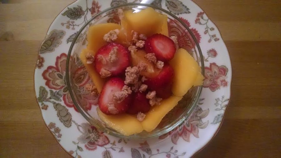 Otros días sustituyo el zumo por un un bowl como este de mango, fresa, media naranja entera y media exprimida, cereales y una cucharadita de miel, o de plátano, melón y manazana, o de sandía, piña y naranja, vamos cualquier combinación que se me ocurra! y siempre con 3 piezas de fruta mínimo.